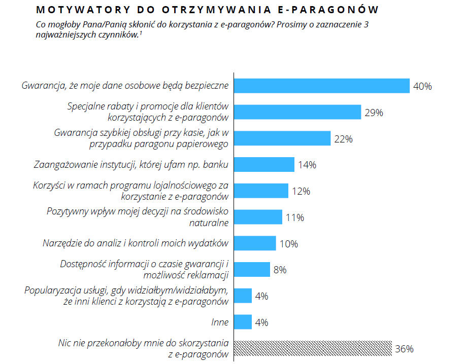 Bezpieczeństwo to główny motywator wśród badanych. Spora grupa nie jest przekonana do tej formy i nie dałaby się przekonać. Z biegiem lat osoby dzisiaj młode, które przychylniej patrzą na e-paragony będą zastępowały obecnych seniorów. Czy jest to szansa na całkowite wdrożenie takiej formy, czas pokaże.